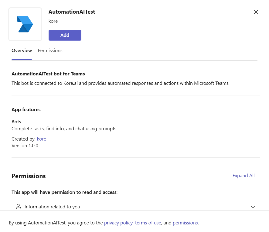 Add and Test the App. Click Add to install the app/agent. Open the app within Teams (or Copilot) and verify that all bot interactions and features are working as expected.