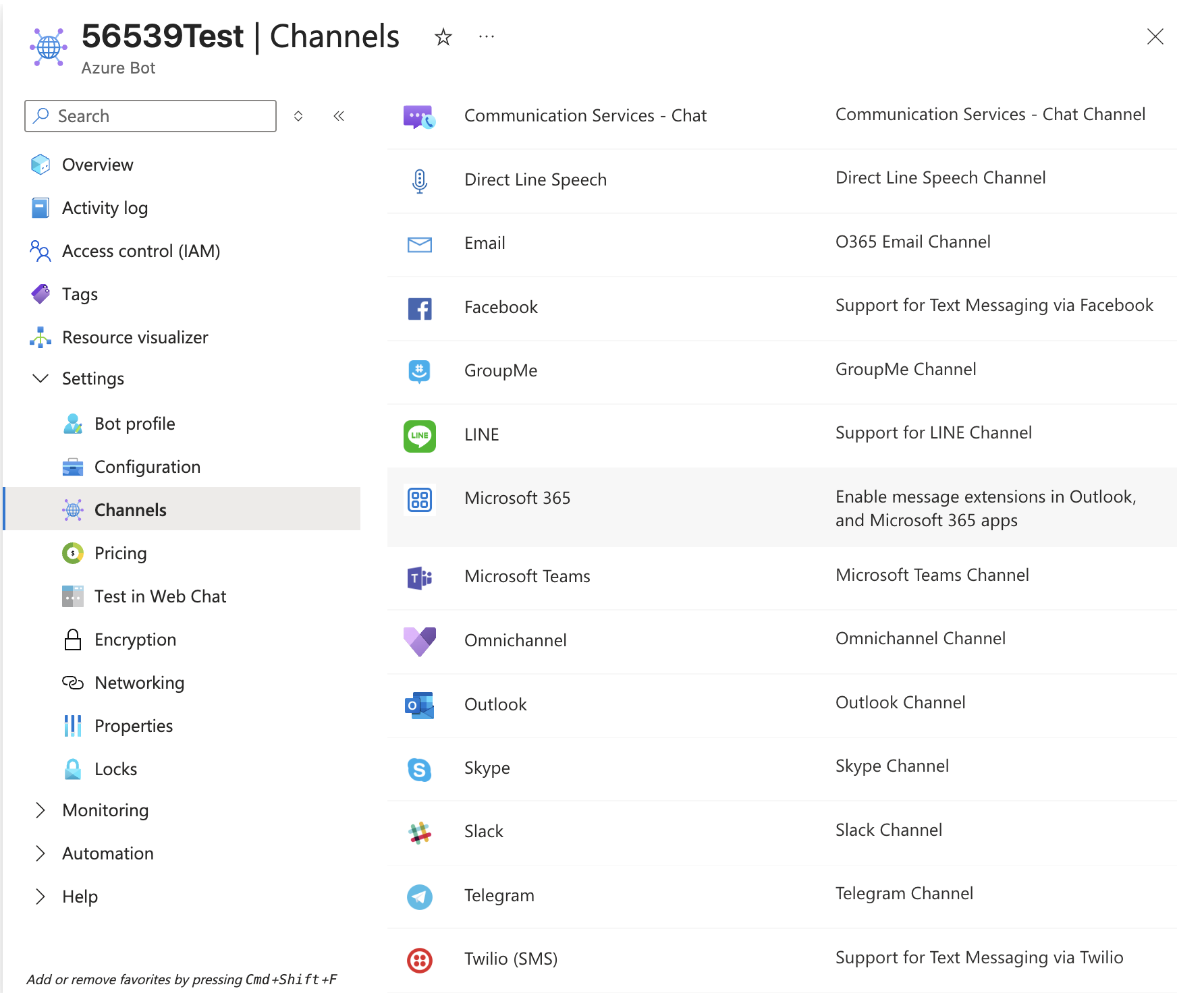 Go to the Channels section from the menu and select the Microsoft Teams and Microsoft 365 channel listed under the Available Channels.
