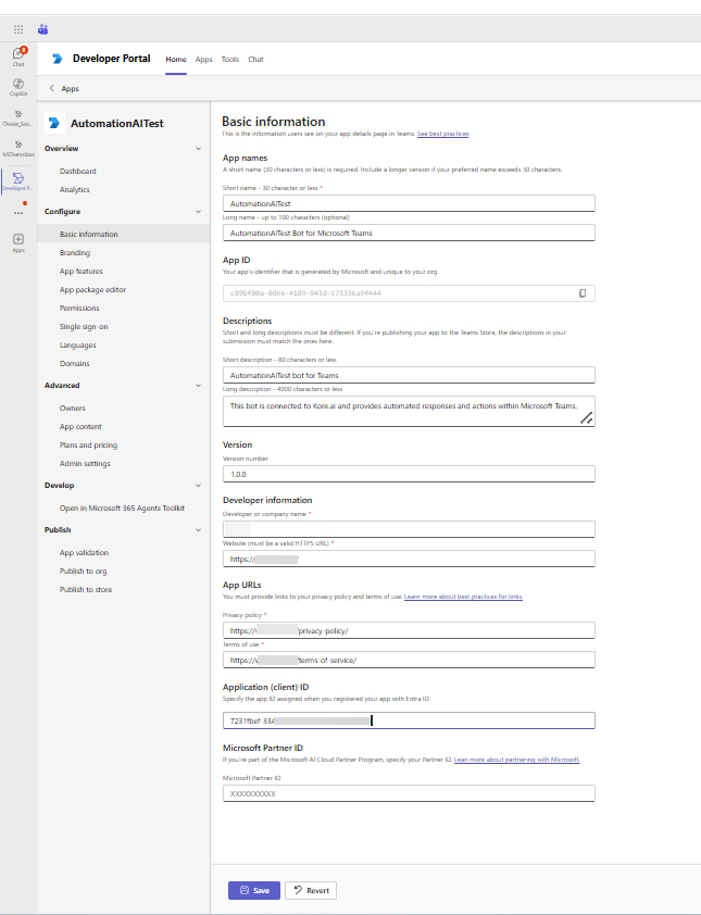 Enter the required App Details. Ensure that the Microsoft App ID entered here is the same as the App ID configured in Azure and the Platform, maintaining consistency across all systems. This prevent errors during zip file creation. For Application (Client) ID, enter the Microsoft App ID associated with your bot’s channel configuration.