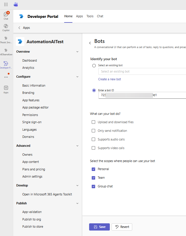 Navigate to App Features > Bot. Select the Enter a bot ID, enter the Microsoft App ID and enable all required scopes.