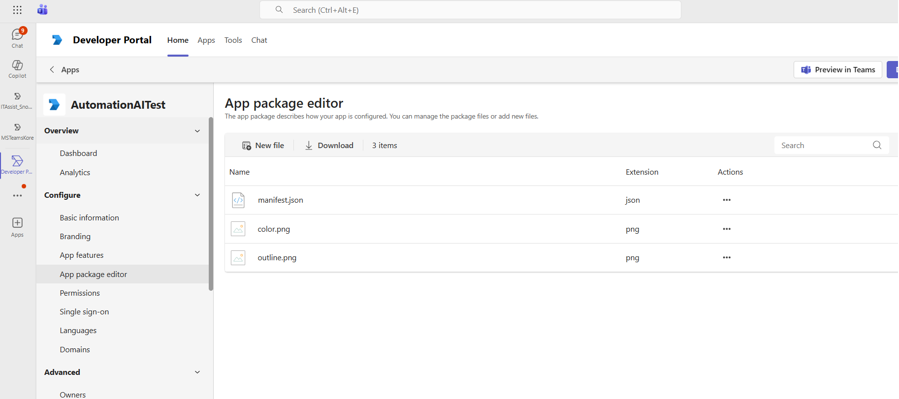 Open App Package Editor. It displays manifest.json, color.png, and outline.png. After verifying the details, download the ZIP package.
