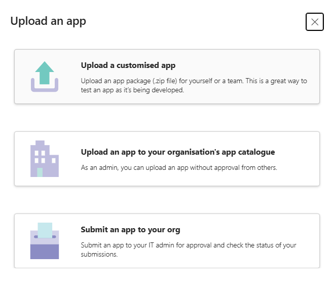 Upload the App into Teams: Go to Teams > Apps > Manage your Apps. Click Upload an app and select the ZIP package downloaded in the previous step. This will upload your custom Teams app to your tenant.