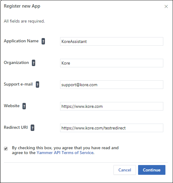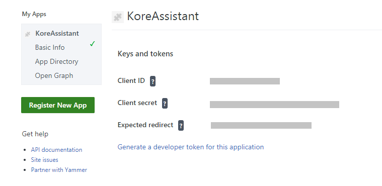 To add Yammer as a channel to your Kore.ai assistant, you must create an app in Yammer and enable the platform to receive messages. Adding the Yammer channel to your Kore.ai assistant allows end-users of your app to interact with your app using their Yammer accounts. To add the Yammer channel to your app, you must: