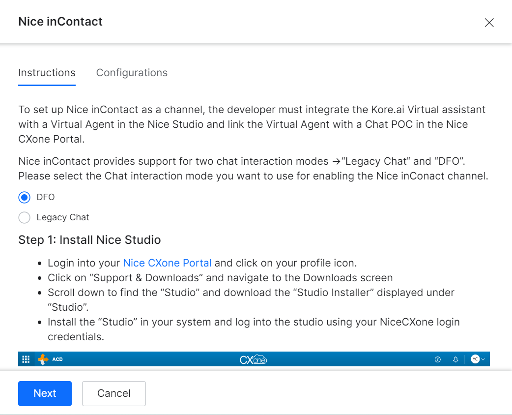 The Nice inContact as a Channel supports two chat interaction modes, DFO and Legacy Chat.