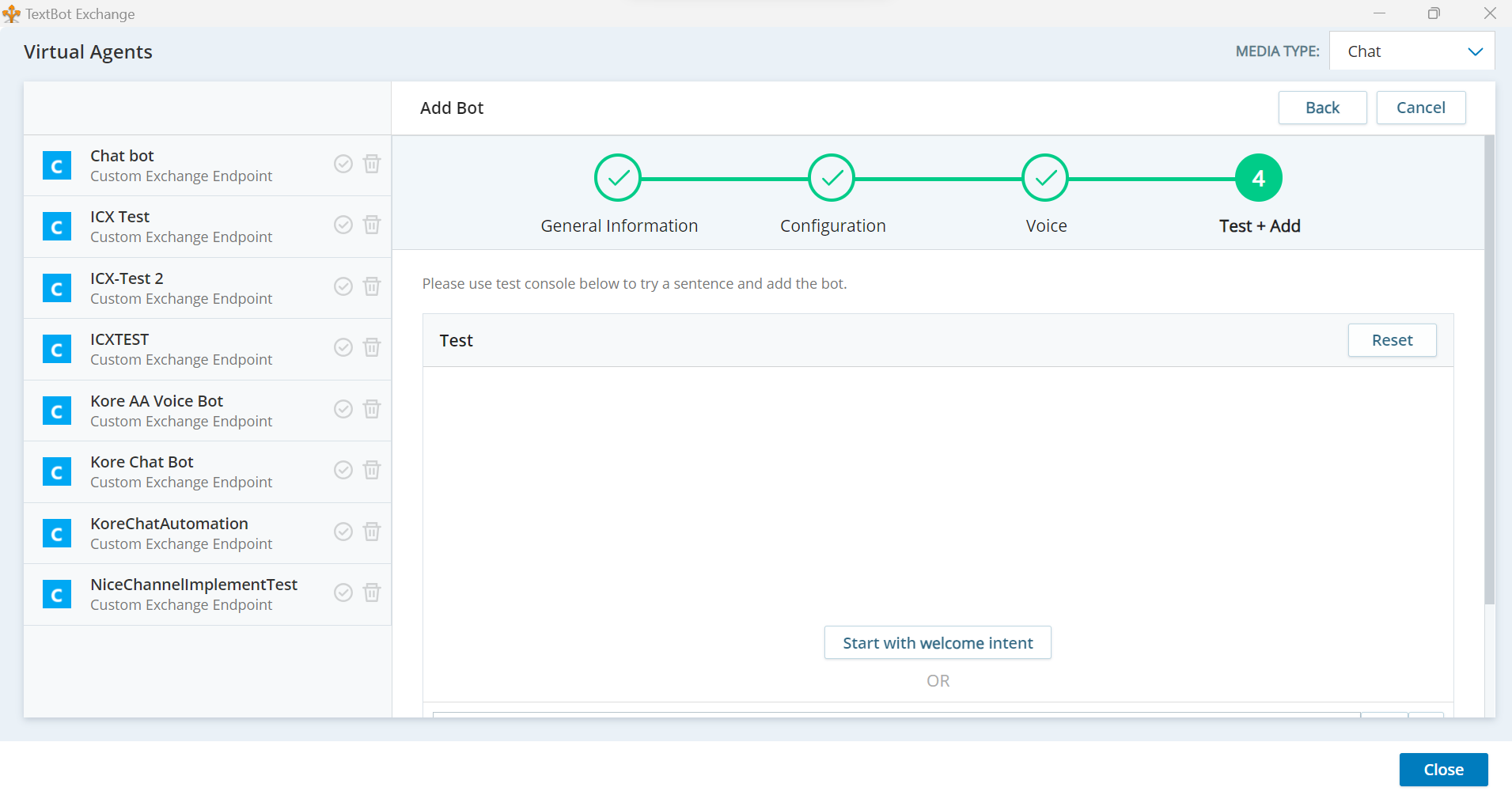 On the General Information page, type in the bot name, select Custom Exchange Endpoint, and click Next.