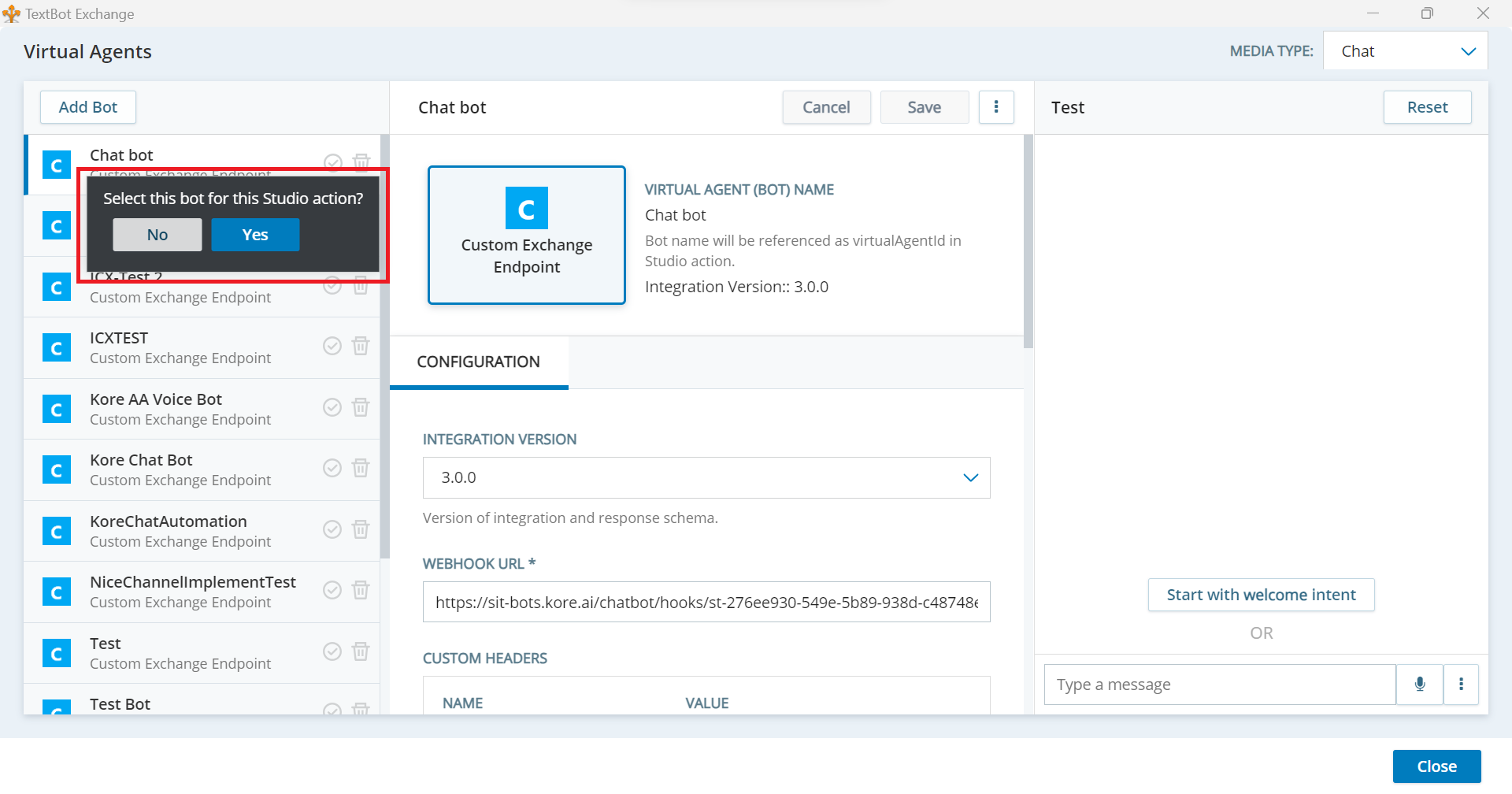Click the right tick mark next to the created bot. The “Select this bot for this Studio action?” pop-up is displayed.