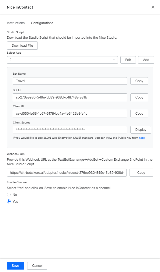 Perform the following steps to enable Nice inContact as a channel, download the Studio Script, and get the Webhook URL and client ID from the XO Platform.