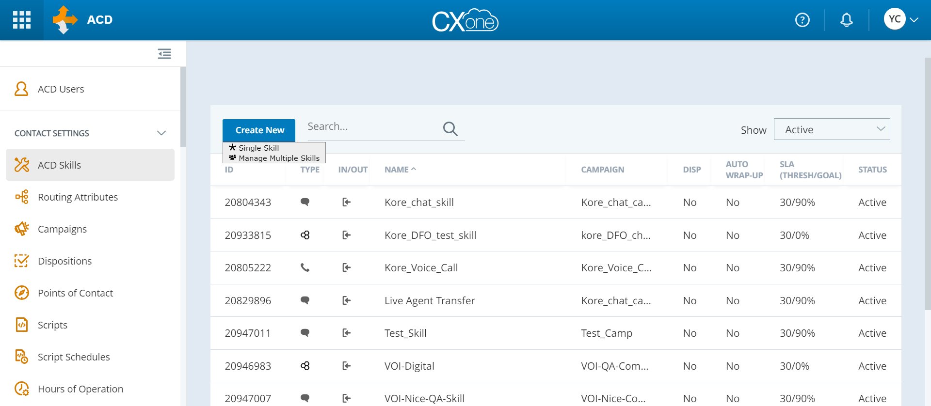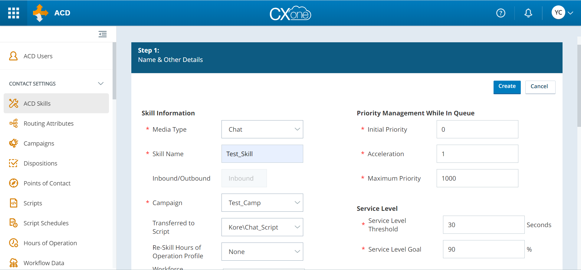 In the left side vertical menu, under Contact Settings, click ACD Skills > Create New > Single Skill.