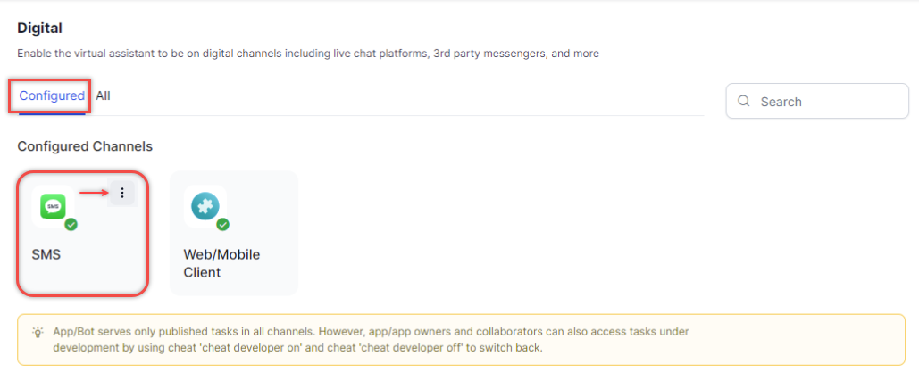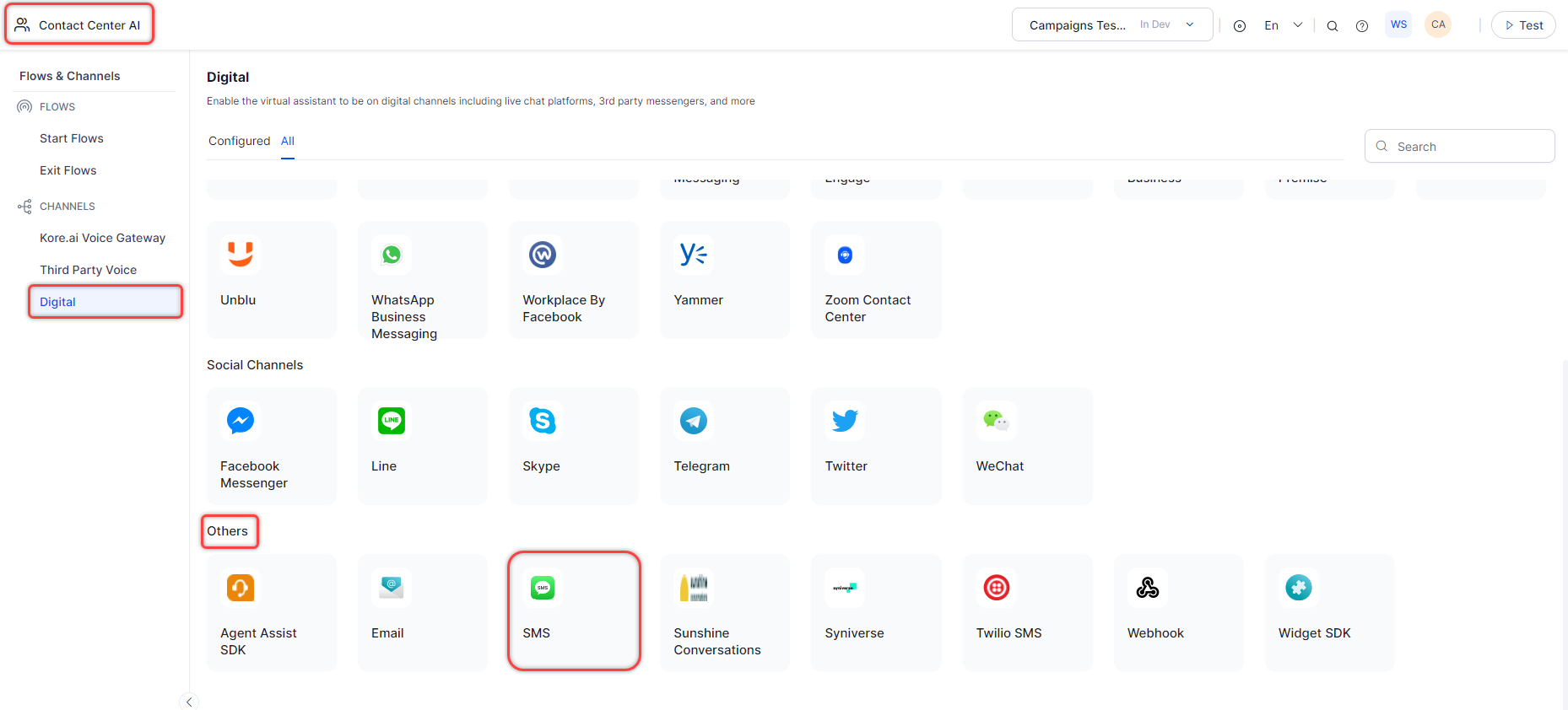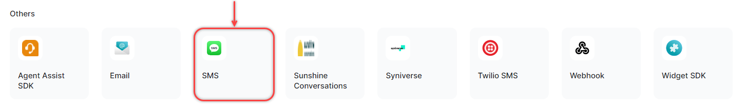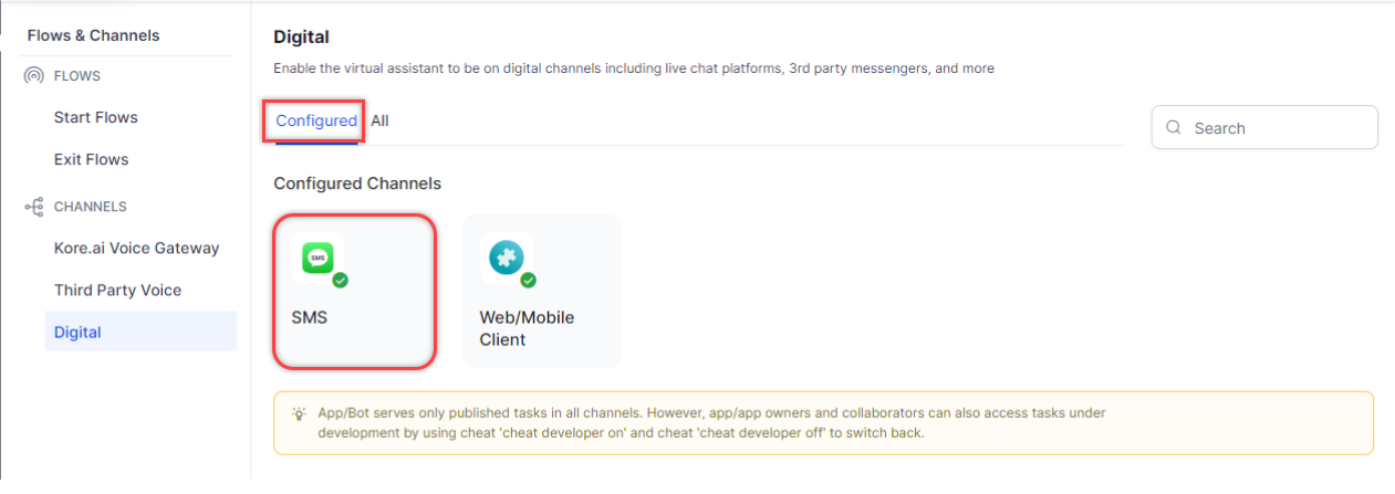 Clicking the Configure SMS Channel button redirects the user to the Digital channel page. Click SMS.