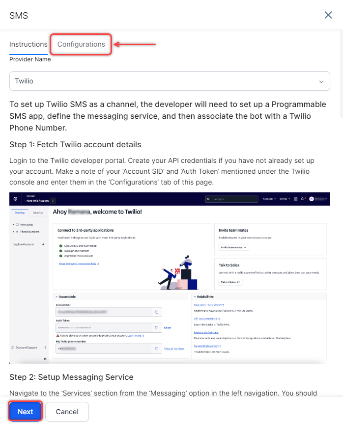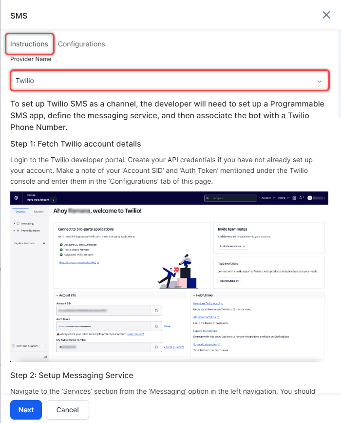 - Enter the Account SID extracted from the Twilio account.