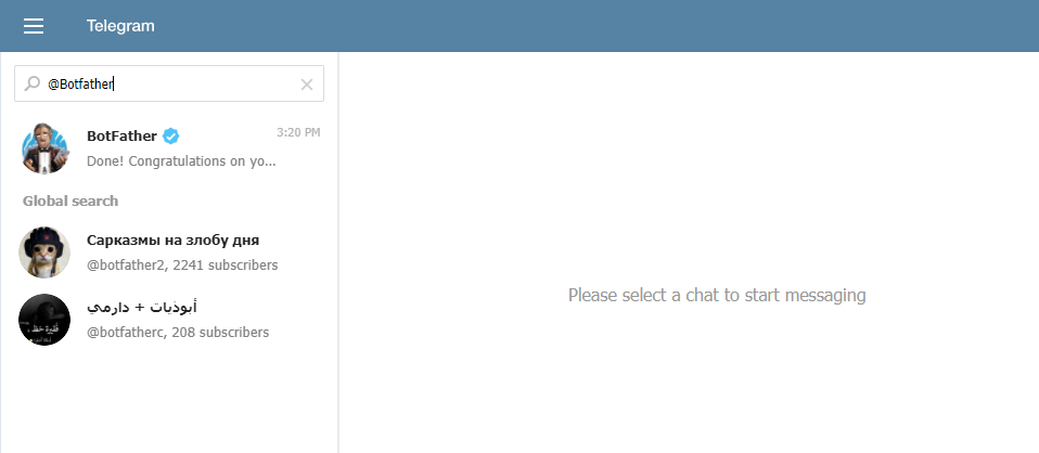 Log into Telegram and search for @BotFather from the Search bar as shown below.