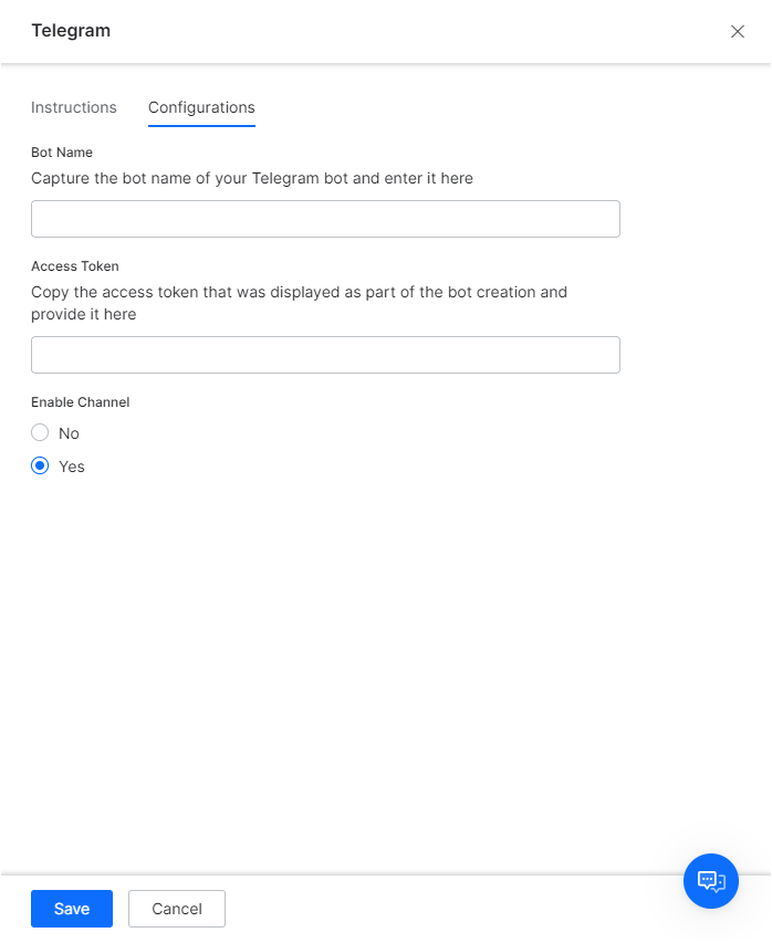 - Select Yes and then click Save to enable the Telegram Channel for your bot.