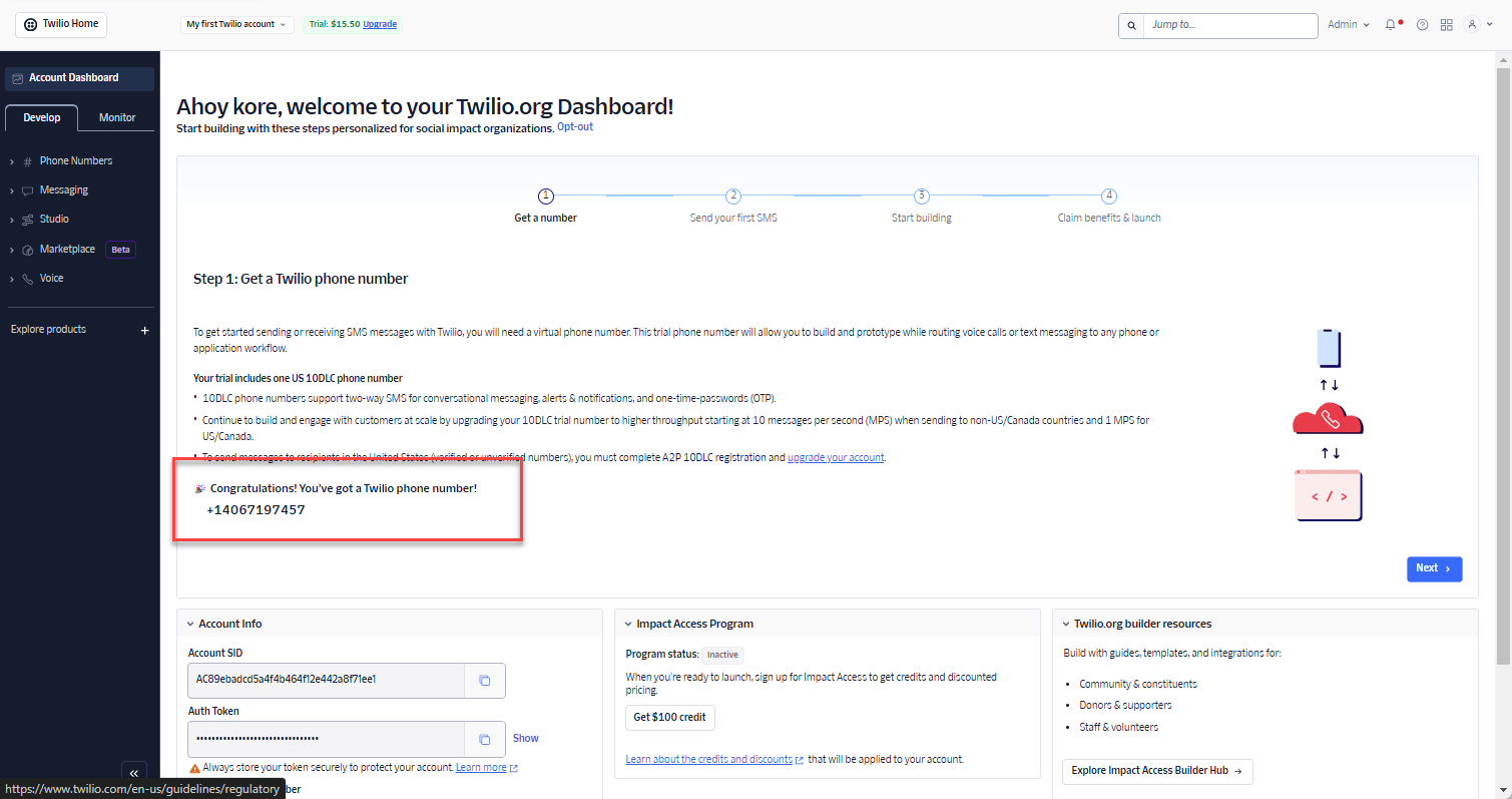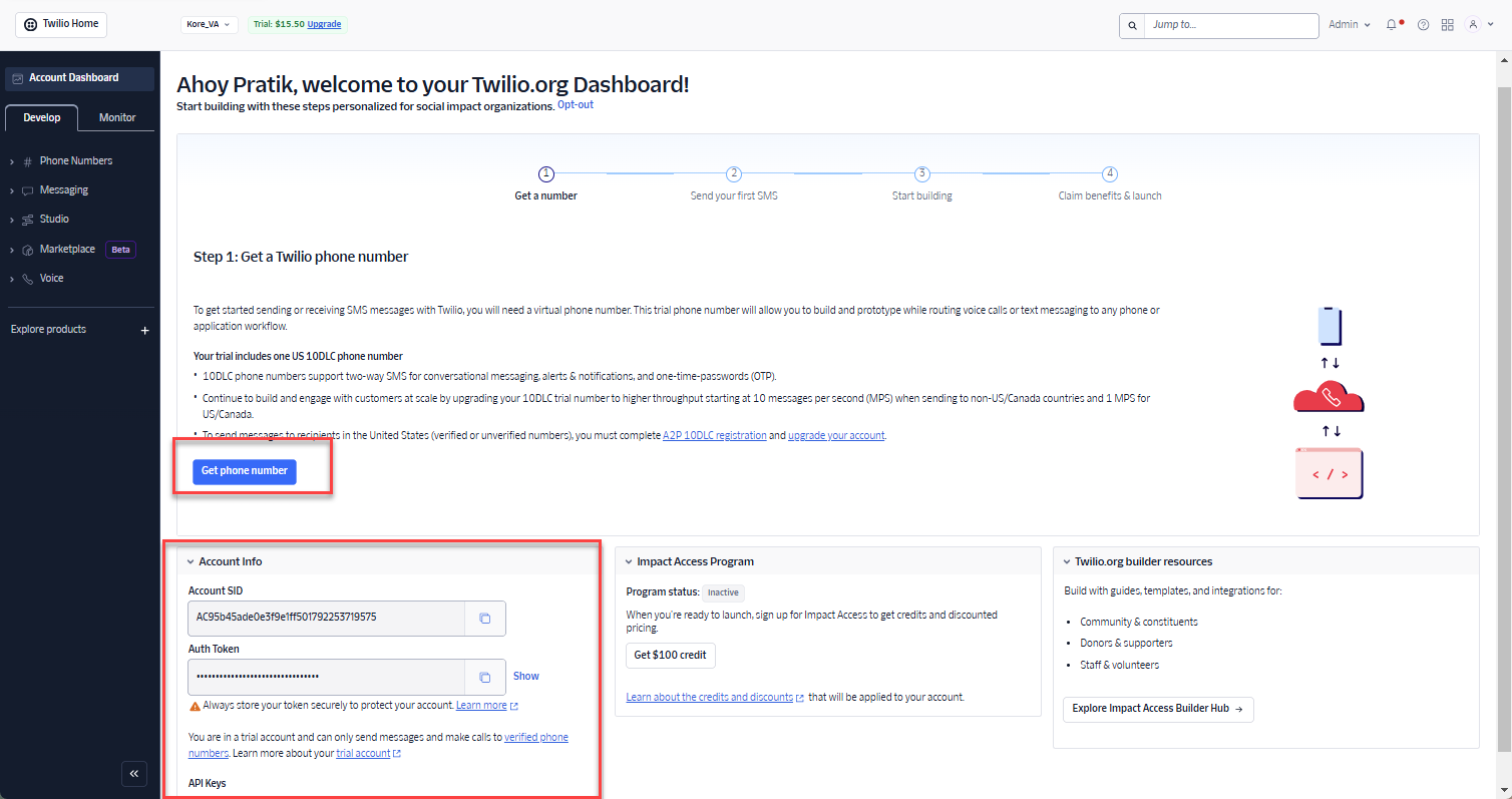 - Create a Twilio account and get the Phone Number.