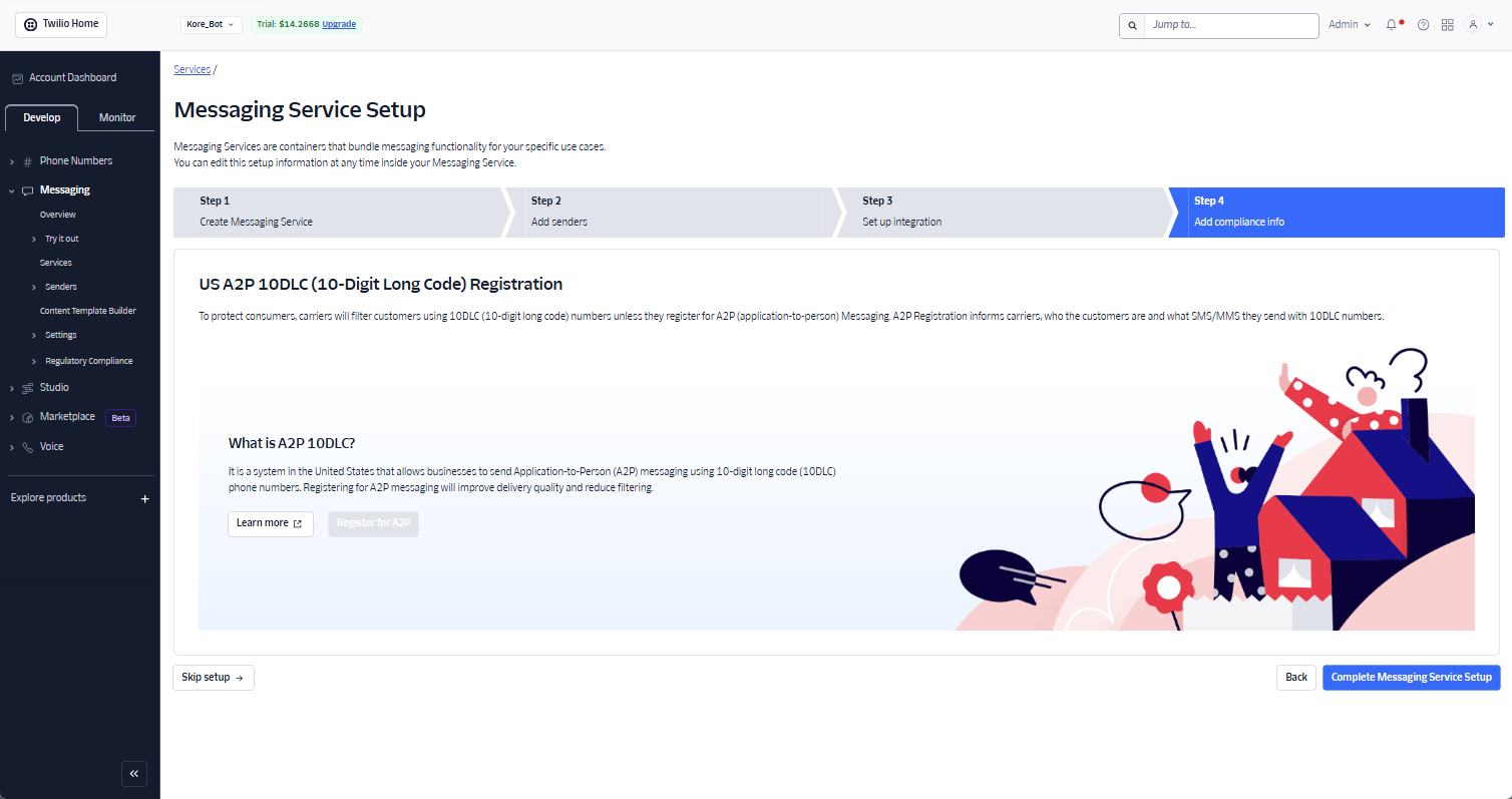 Click Step 4: Add compliance info. The success message is displayed and then, click Complete Messaging Service Setup.