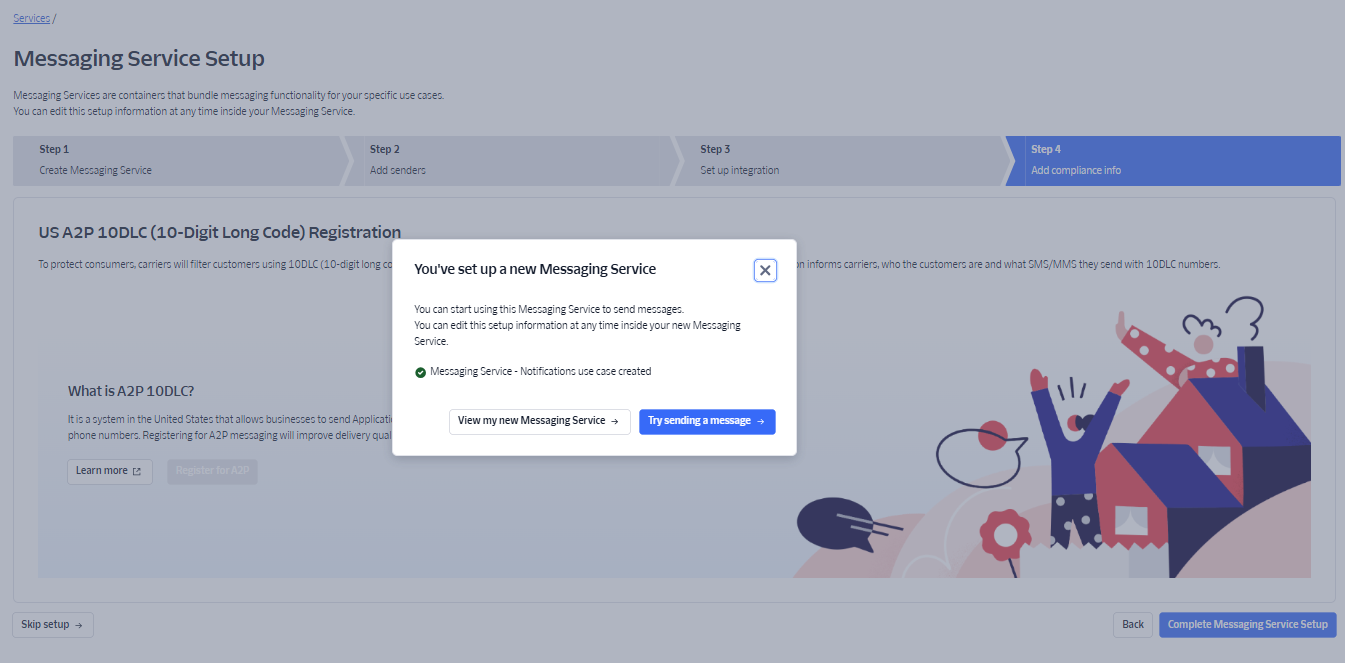 The setup complete pop-up appears. Click View my new Messaging Service.