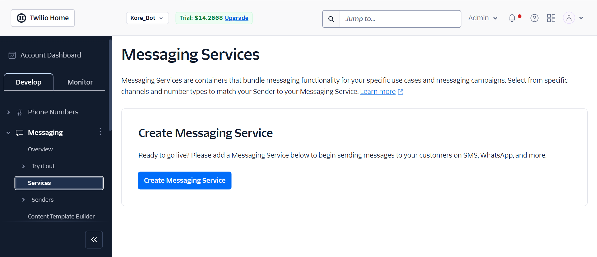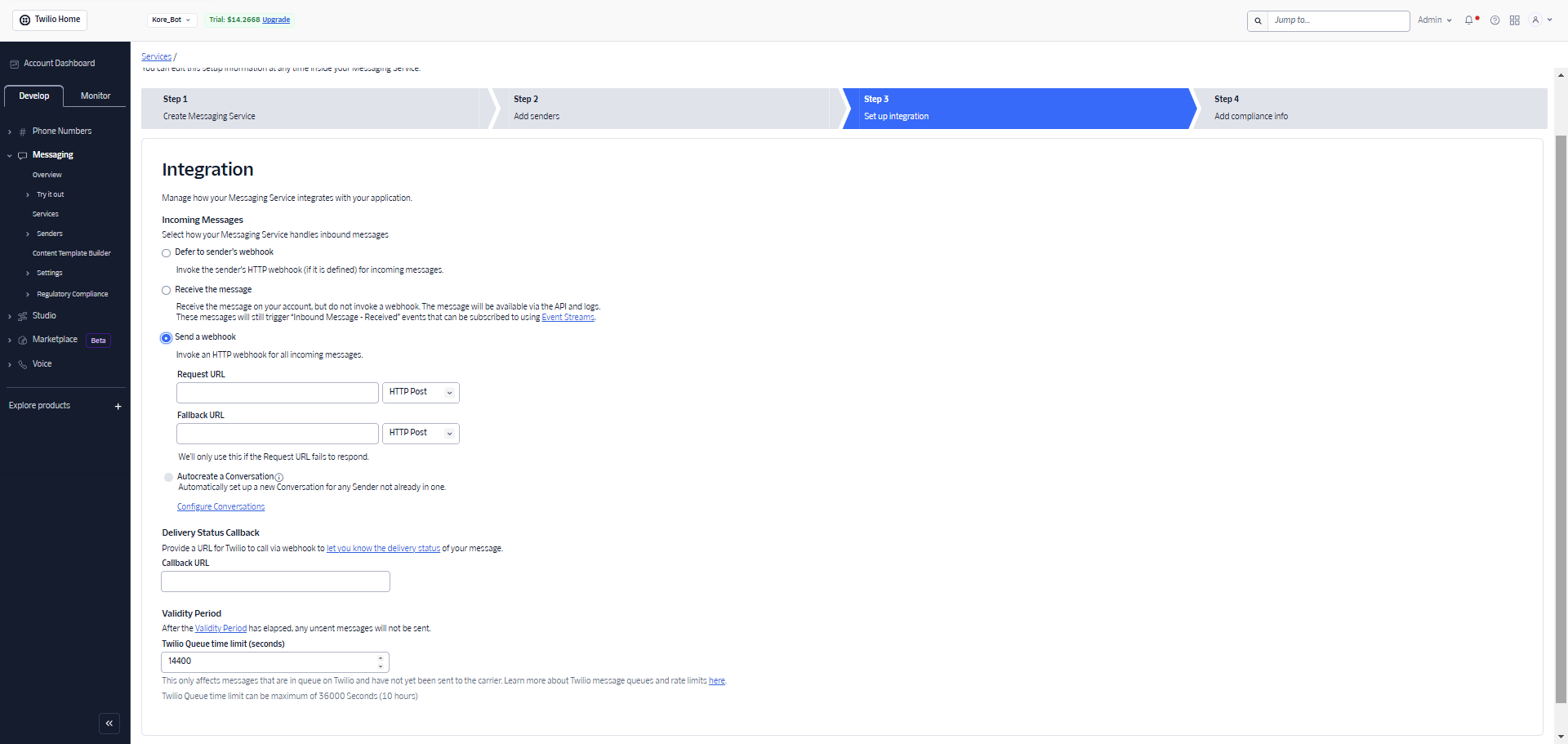 Go to Account Dashboard > Develop > Messaging > Services and click Create Messaging Service. The messaging service setup page is displayed.