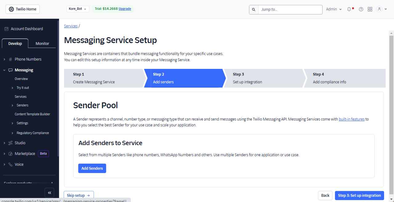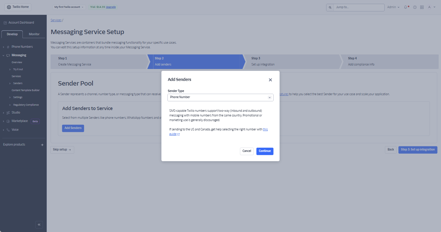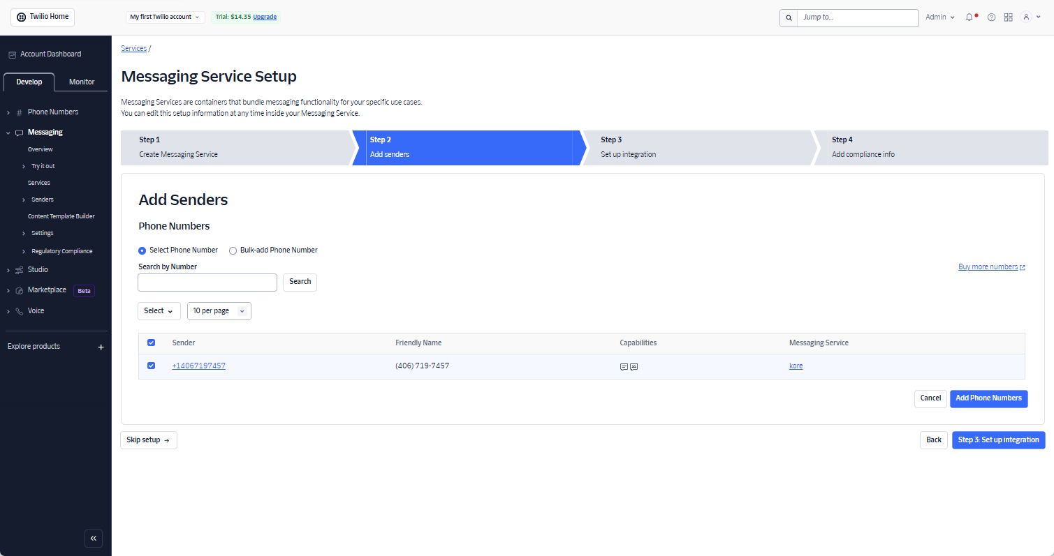 - Create a Twilio messaging service.