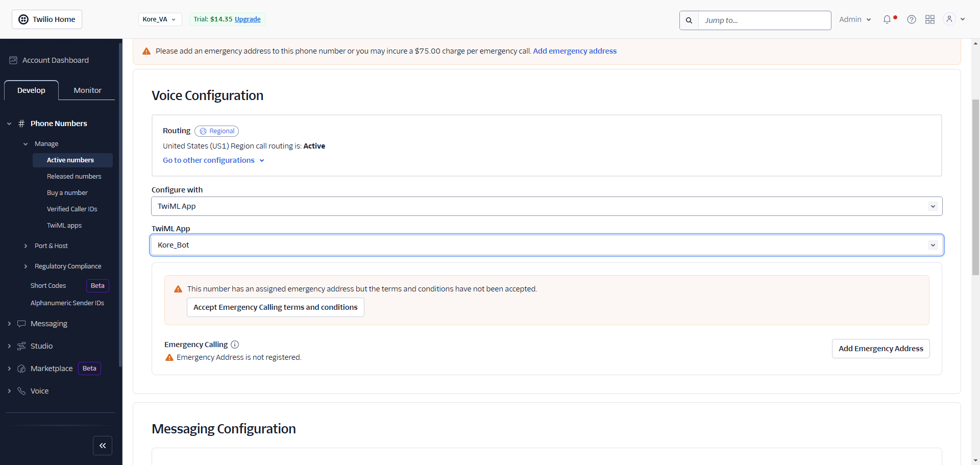 - Go to Twilio Account Dashboard > Develop > Phone Numbers > Manage > Active Numbers.