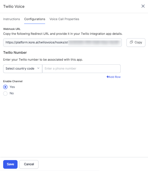 To add Twilio Voice as a channel to your Kore.ai assistant, you must get a Twilio phone number and set up a webhook integration to communicate with the AI Agent.