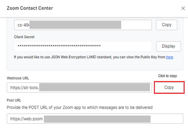 Copy the Webhook URL from the Zoom Contact Center > Configurations section of the XO Platform.