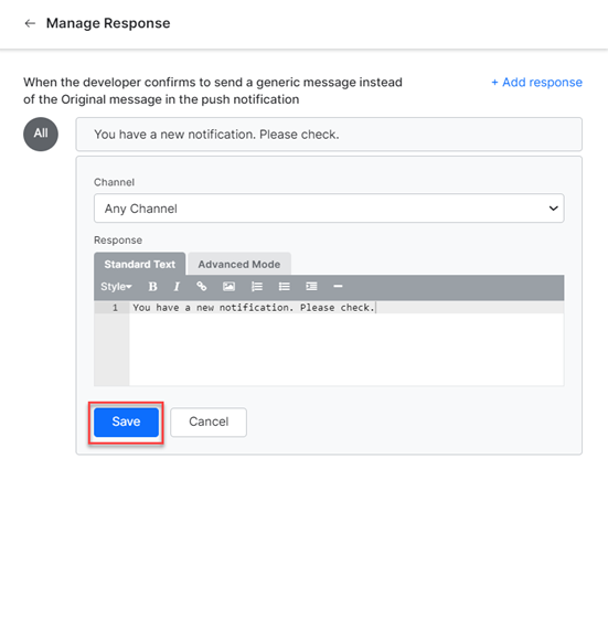 Click Manage Responses to add custom messages in the push notification. To learn more about adding responses, read articles Default Standard Responses and Default Conversations.