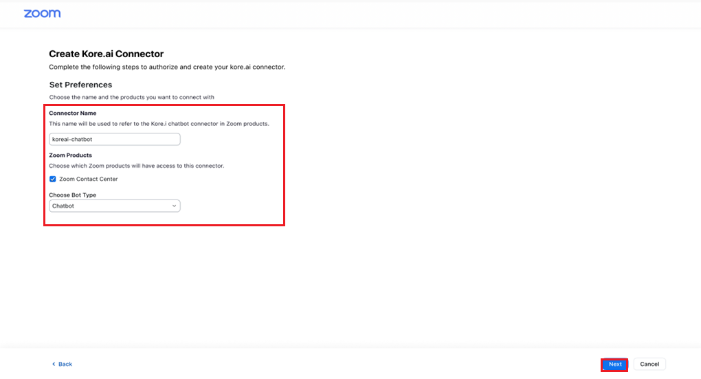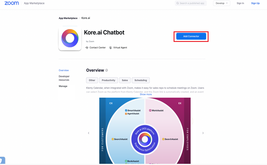 To set up Zoom Contact Center as a channel, the AI Agent has to be associated with the instance of the Kore.ai Chat bot connector available in the Zoom app marketplace. To create a Chatbot Connector, follow the steps below: