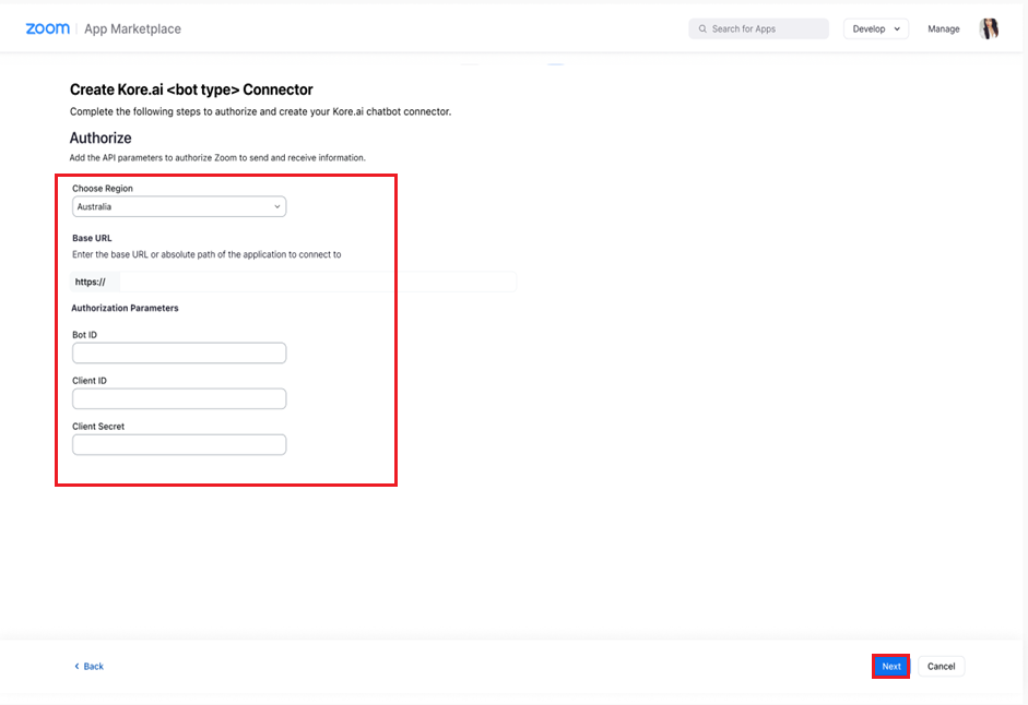 The next step after creating a connector is to authorize it on the Create Kore.ai Connector page of the Zoom App Marketplace portal. To configure, follow the steps below: