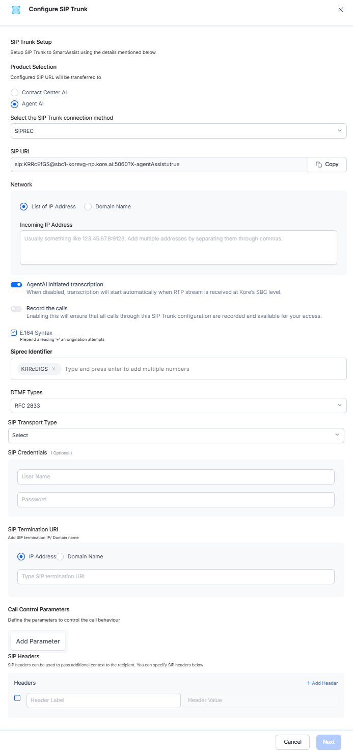 Select the SIP Trunk connection method: Select the method based on your third-party vendor’s requirements (SIPREC or WebSocket).