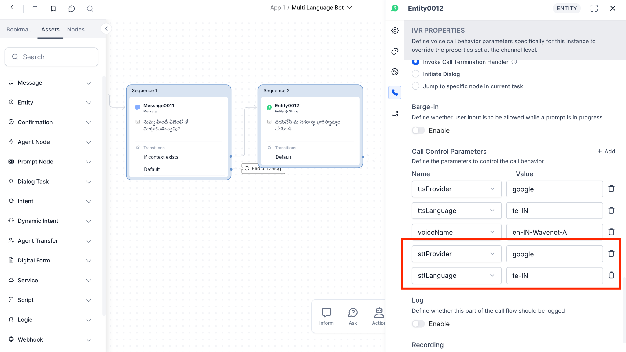 - In a specific Dialog Flow node (for example, a Message or Entity node), select the IVR Properties tab.