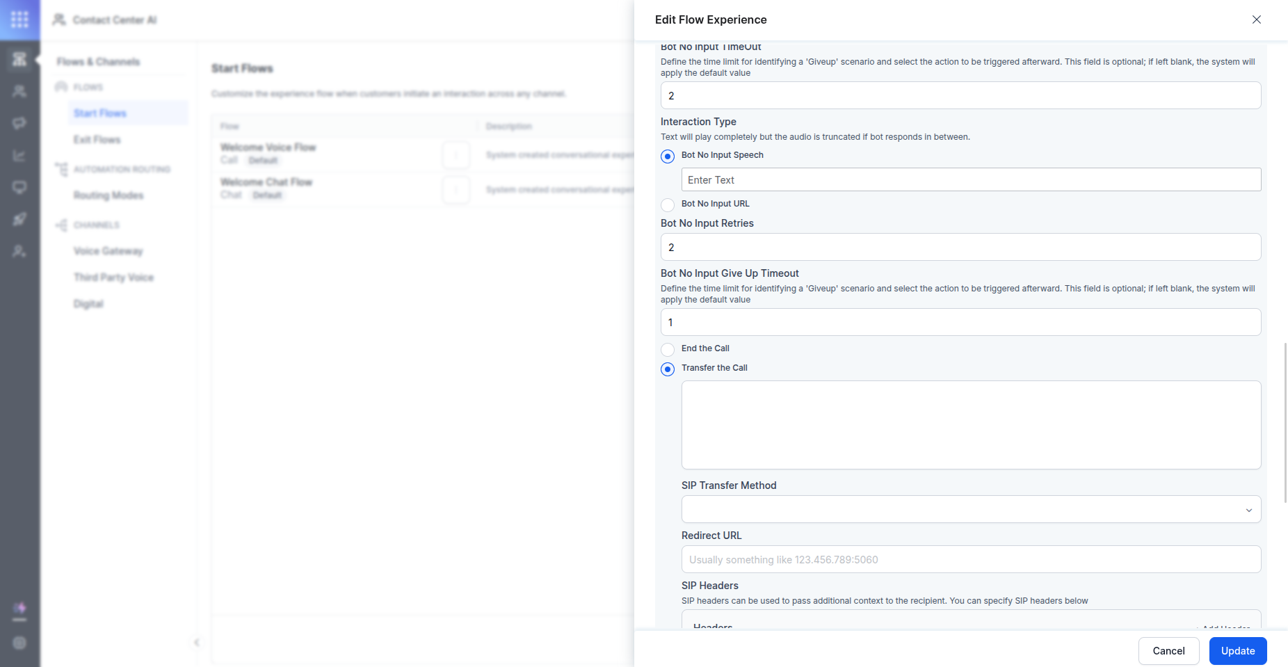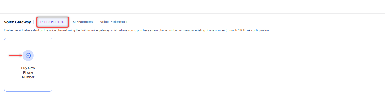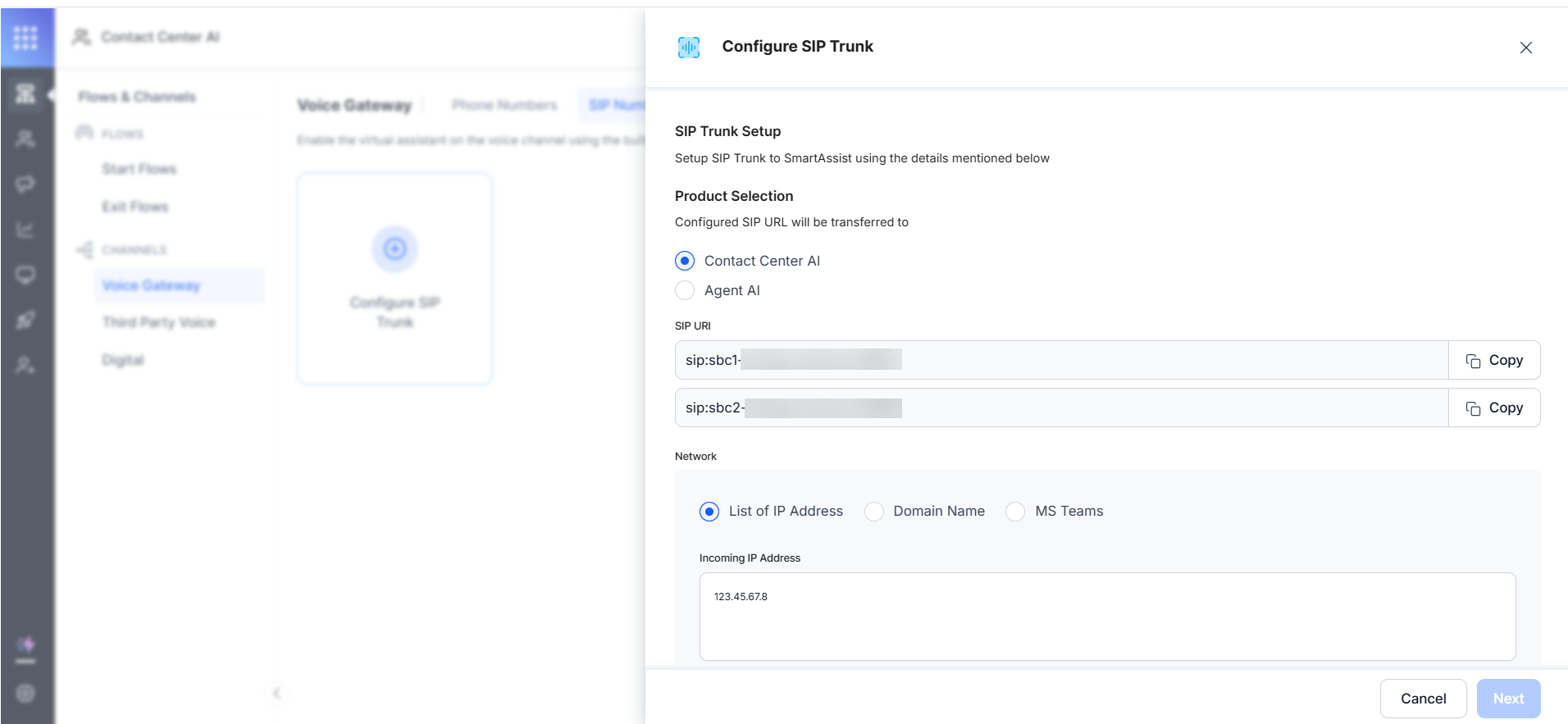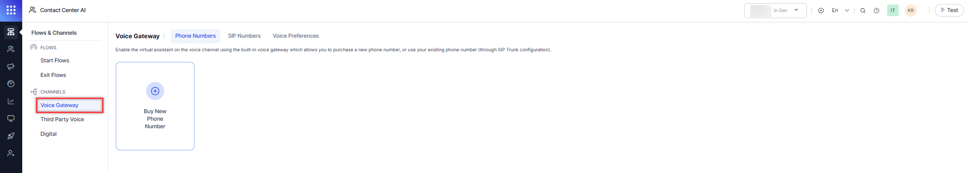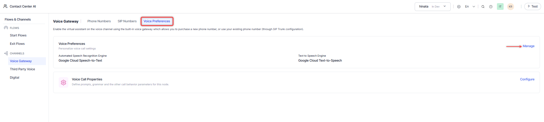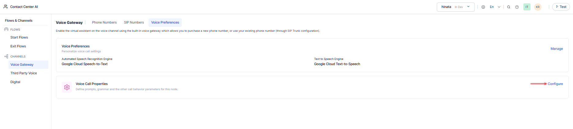 Go to The Product (For example, Automation AI/ Contact Center AI) > Flows & Channels > Channels > Voice Gateway.