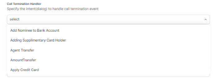 Specify the intent (dialog) to handle the call termination event from the dropdown.