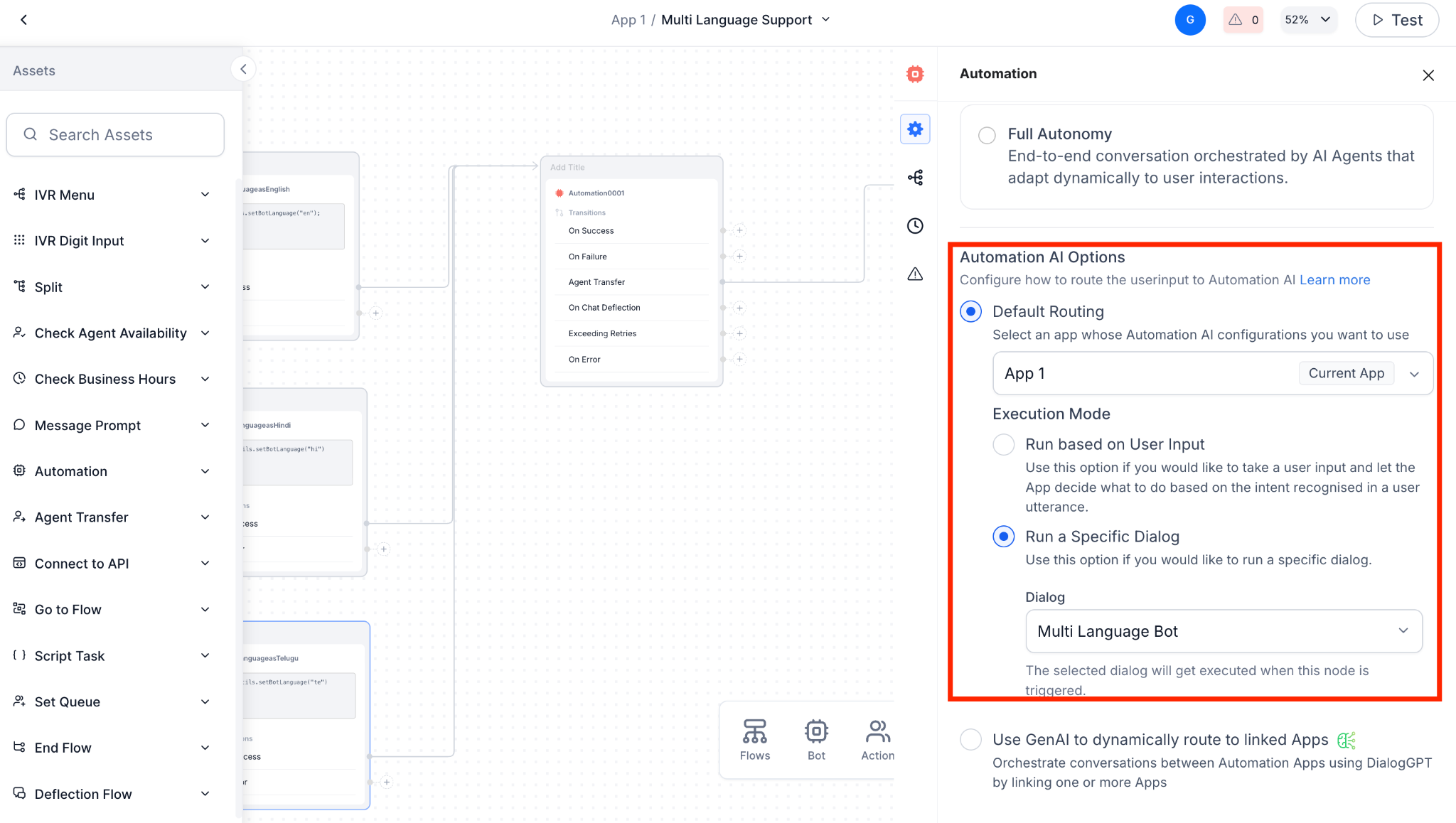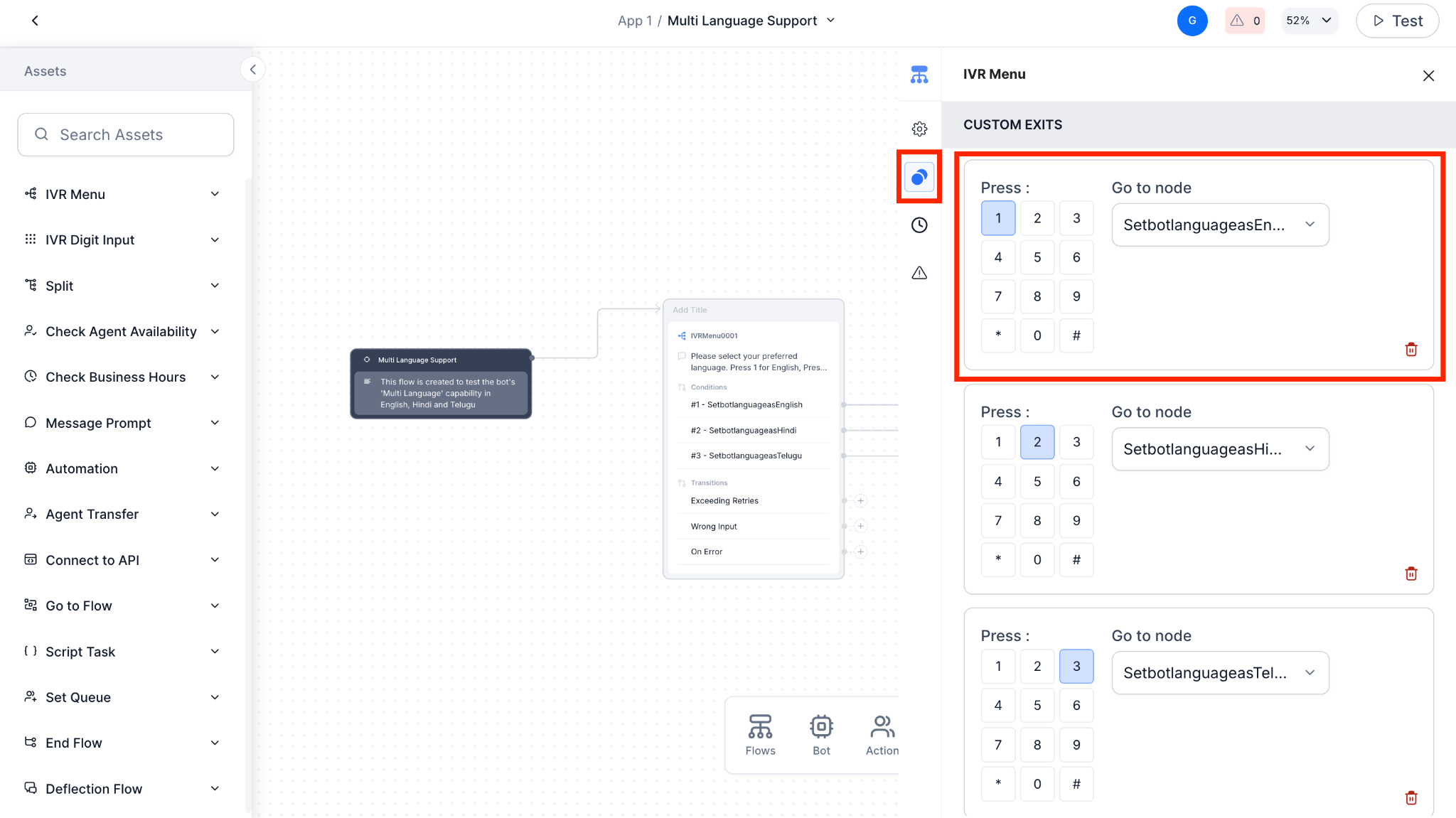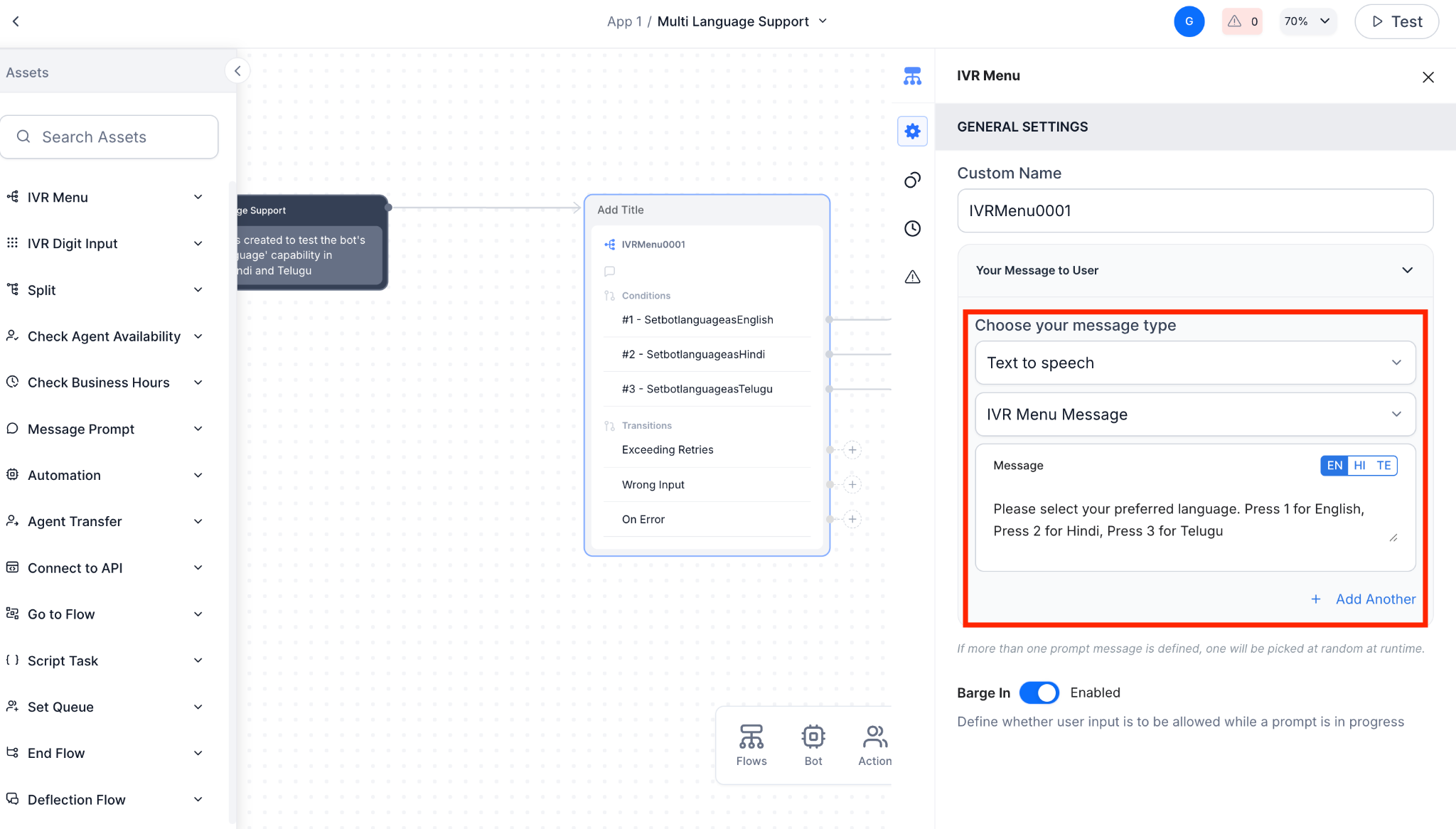 In the IVR Menu node, create prompts for each language option (for example, "Press 1 for English," "Press 2 for Hindi," "Press 3 for Telugu").