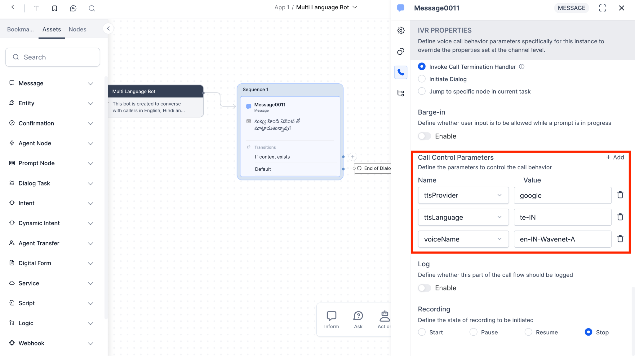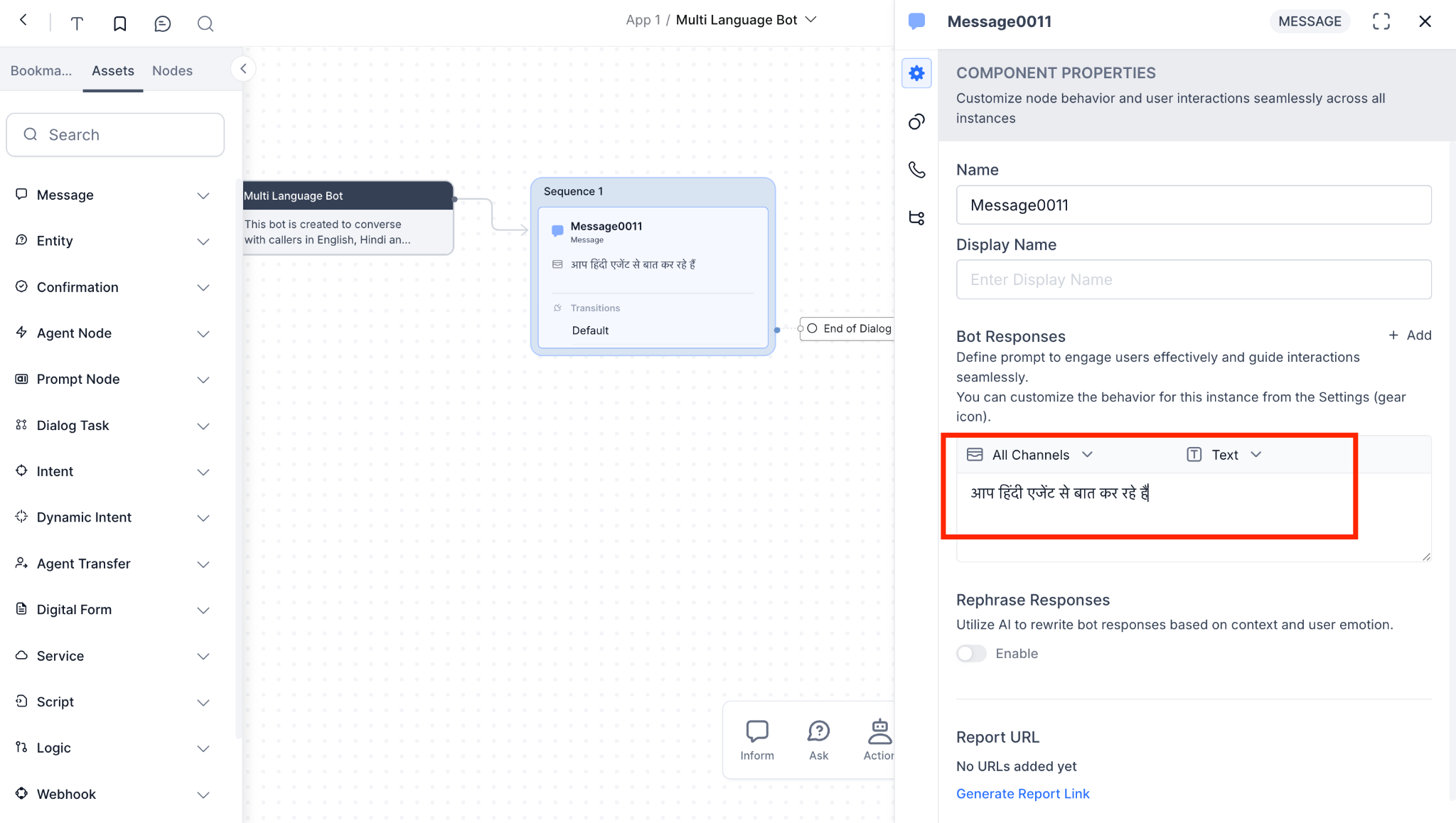 Example: For a Message node, if you've selected Hindi, you'll enter the Hindi text in the "Bot Response" box.