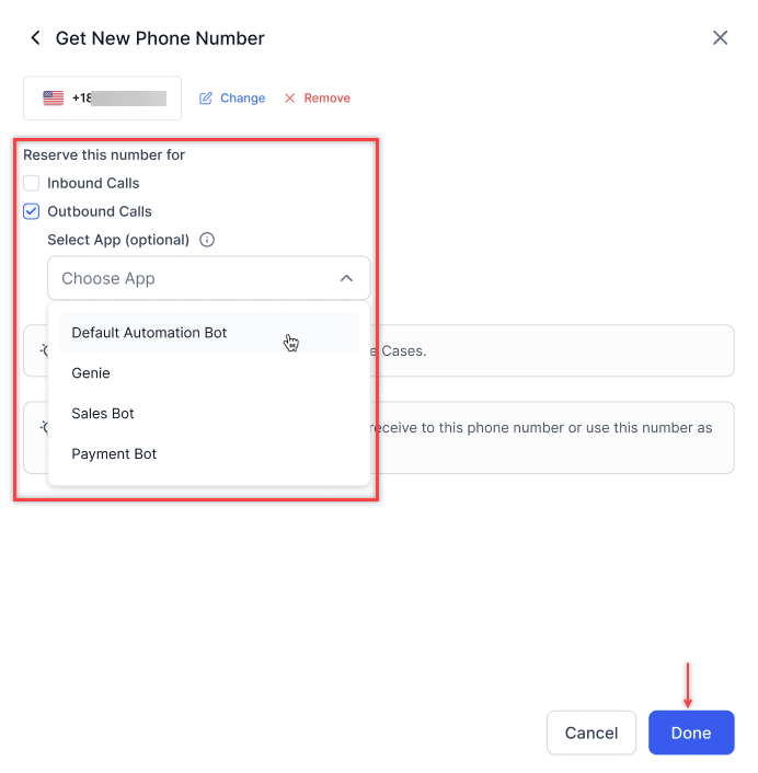 - Select an App for outbound calls from the dropdown. AgentAI triggers this app when the agent makes an outbound call with this phone number.