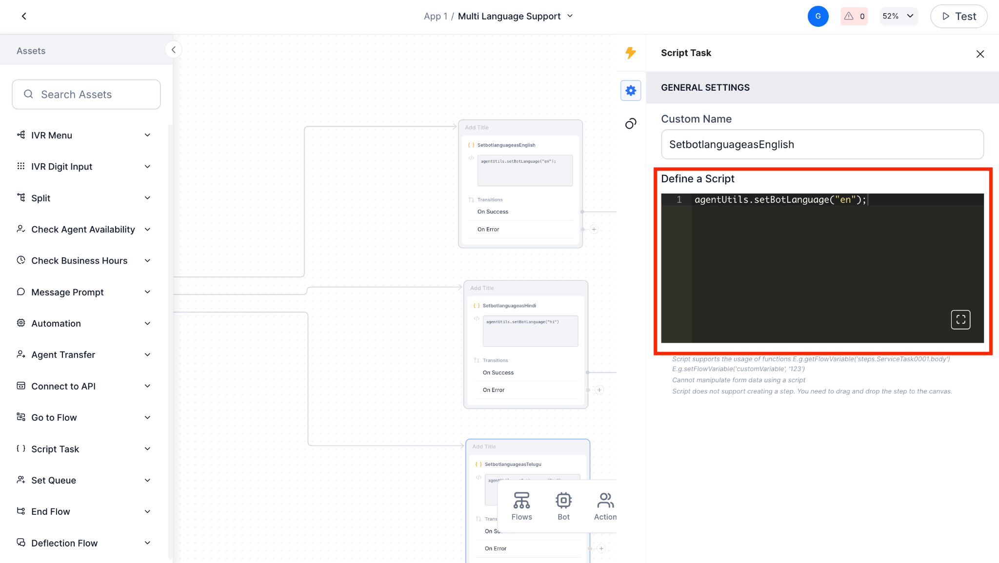 For each language option, connect the number key (for example, "1") to a new Script node. This is the key step where the language is set.