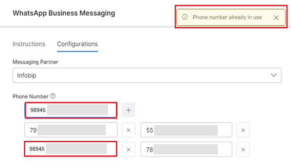 An alert message is displayed when you add a phone number that is already in use (configured on the Platform) as shown below: