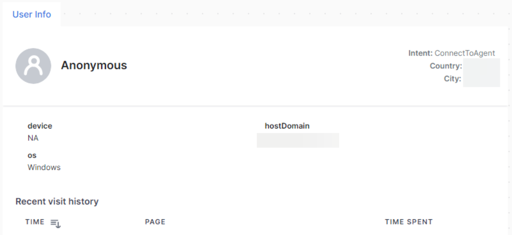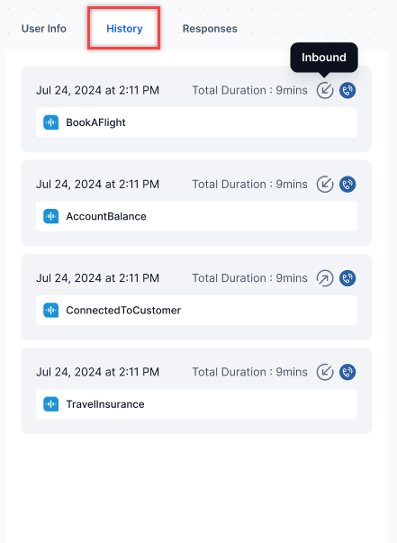 The Conversation History widget shows both inbound and outbound call records, using phone numbers as unique identifiers to link all historical transcripts when new conversations begin. Audio files in messages include download links for the streams. Regular agent-user conversations display as back-and-forth transcripts in the interaction tab. The History widget persists as long as transcripts remain in the database. Clicking any tile shows the complete transcript for that specific interaction. It displays the following details: