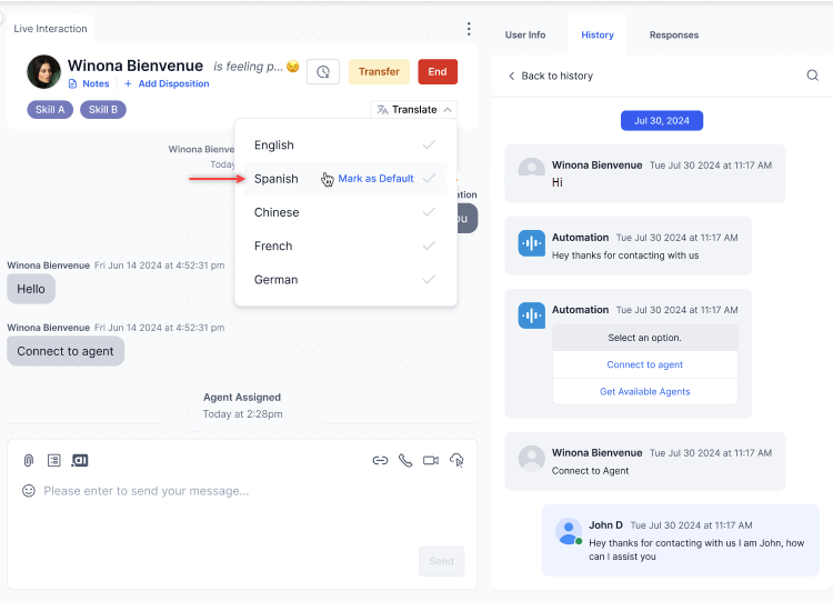 - Select the conversation you want to translate, and then click Translate on the Live Interaction pane.