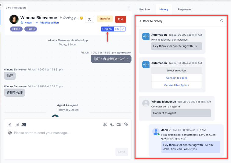 - Click Original to display the conversation in its original language.