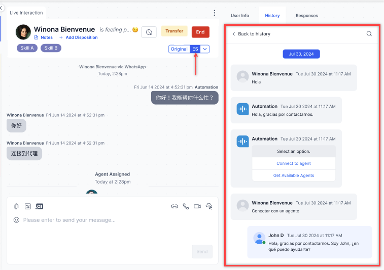 This feature enables users to translate past digital interactions directly within the Chat History Tab, using the same controls as in the Live Agent Console. It allows viewing both the original and translated versions of messages, ensures consistent translations across the platform, and removes the need for external tools.