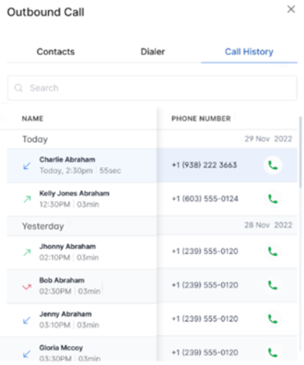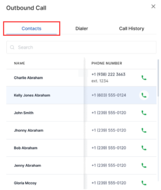 - You can search for a specific name and select Call to initiate an Outbound Call with the selected contact.