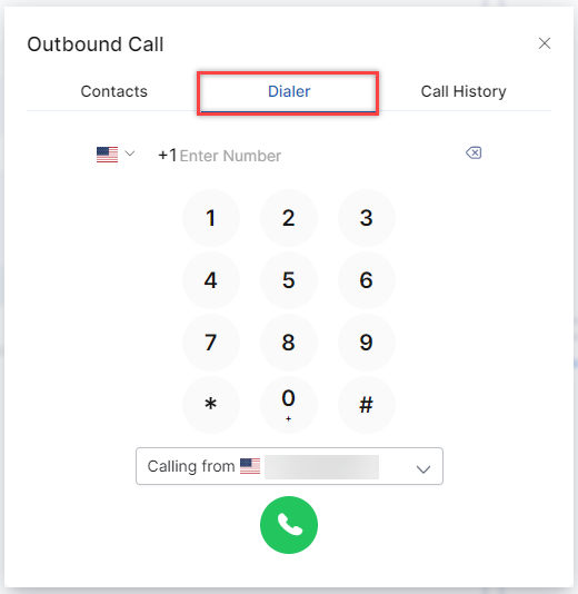 To initiate an outbound call using the Dialer tab, select the country, dial any phone number, and select the Call icon.