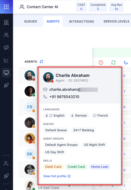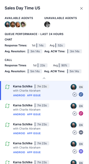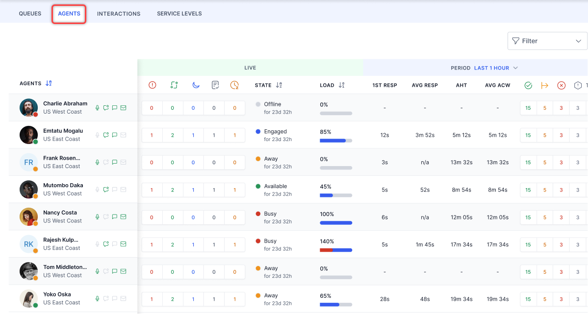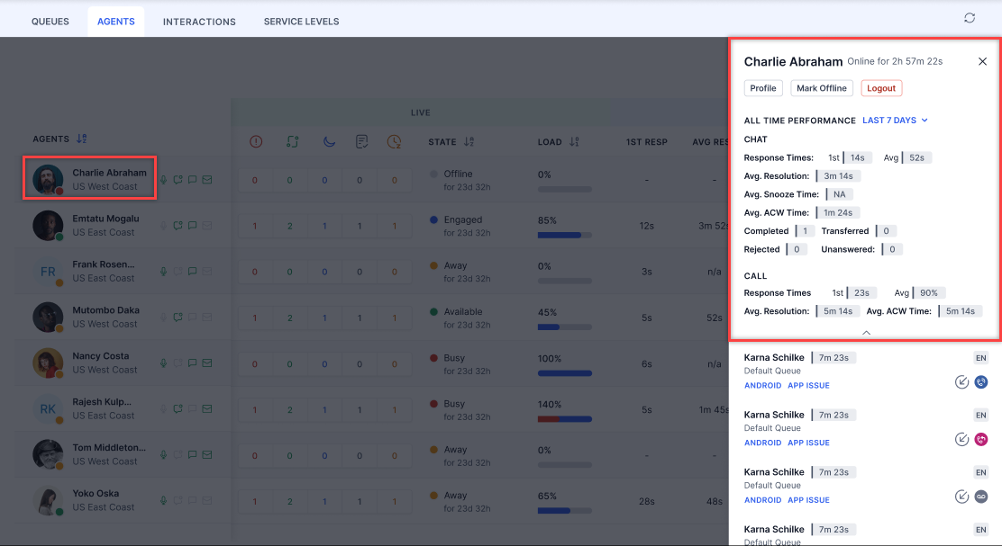 - The Agents section lets you view agent performance metrics and monitor agent-specific live conversations. Listed agents belong to the same queues you are also assigned to.