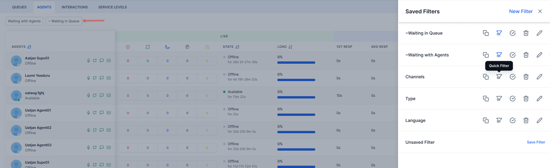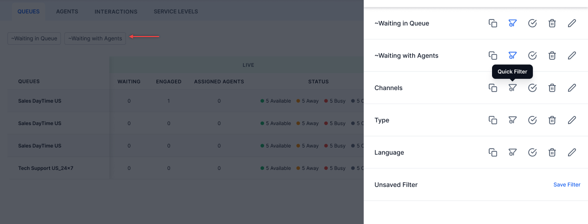 - The Waiting with Agents and Waiting in Queue quick filters are pre-selected. These filters can be edited and deleted.