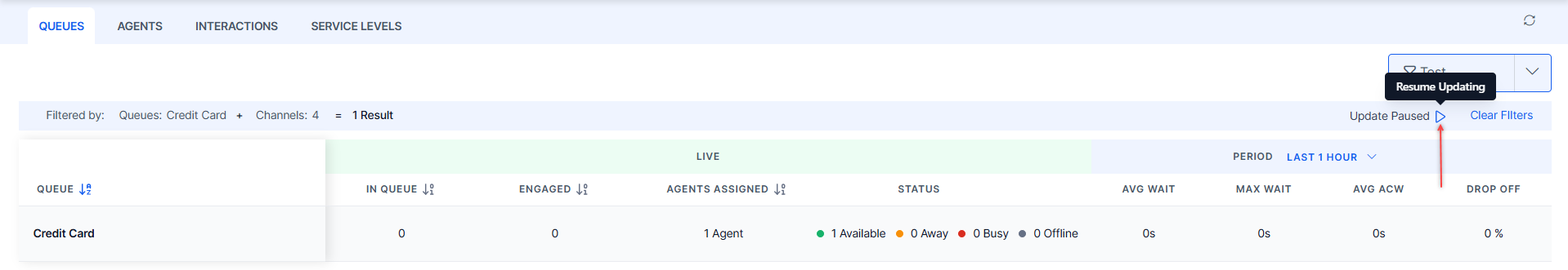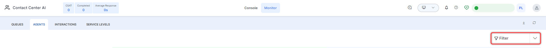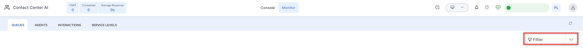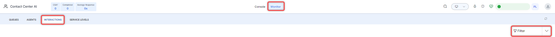 The Monitor tab lets you monitor live conversations between agents and customers and displays four views: Queues, Agents, and Interactions.