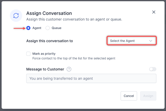 In the Assign Conversation pop-up window, select Agent/Queue, select the agent or queue from the dropdown, mark as priority if required, turn on the message to customer toggle if you want to send a message to the customer, and select Assign.