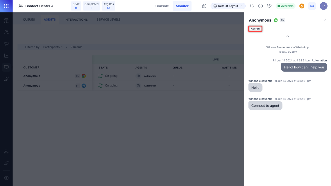 Supervisors can assign bot-led conversations to an agent or a queue. To do so, select an Ongoing conversation and then select Assign.
