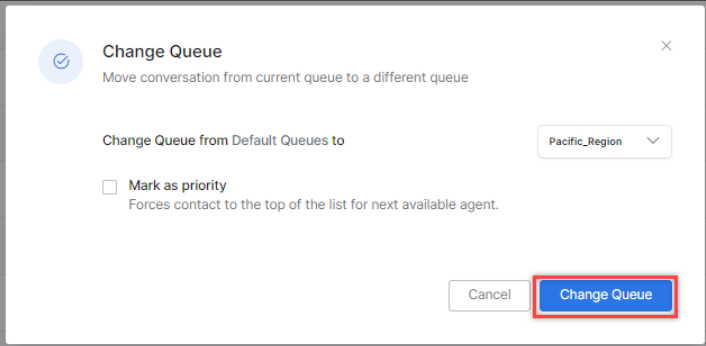 On the Change Queue pop-up window, select the Change Queue from drop-down, select a queue, and then select Change Queue. Select Mark as priority to place the conversation at the top of the list in the destination queue.