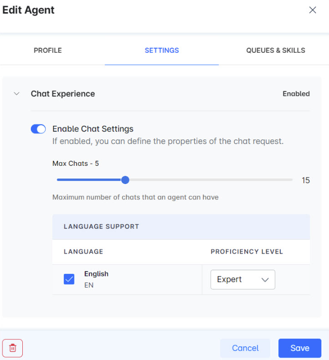 For chat experience, you can enable chat settings. If enabled you can define the properties of the chat request, for example, max chats = 5. You can choose the language and the proficiency level.