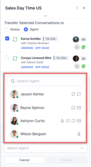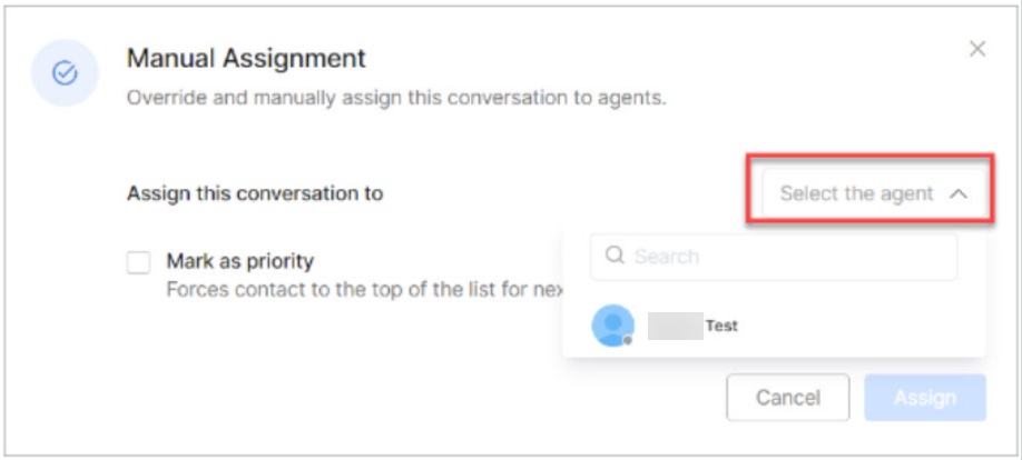 A pop-up appears. Select the agent and assign the conversation to that agent.
